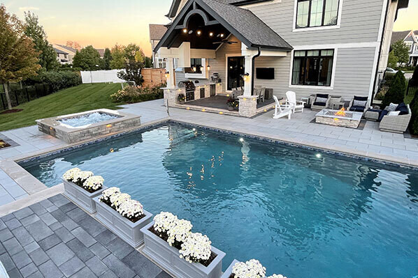 With a custom gunite in-ground pool and spa, outdoor kitchen, a pavilion, firepit lounge and plenty of space to kick a ball around, every box was checked on this family’s wishlist. Using a combination of natural stone and precast concrete we created the ultimate entertaining space for this Elmhurst family.