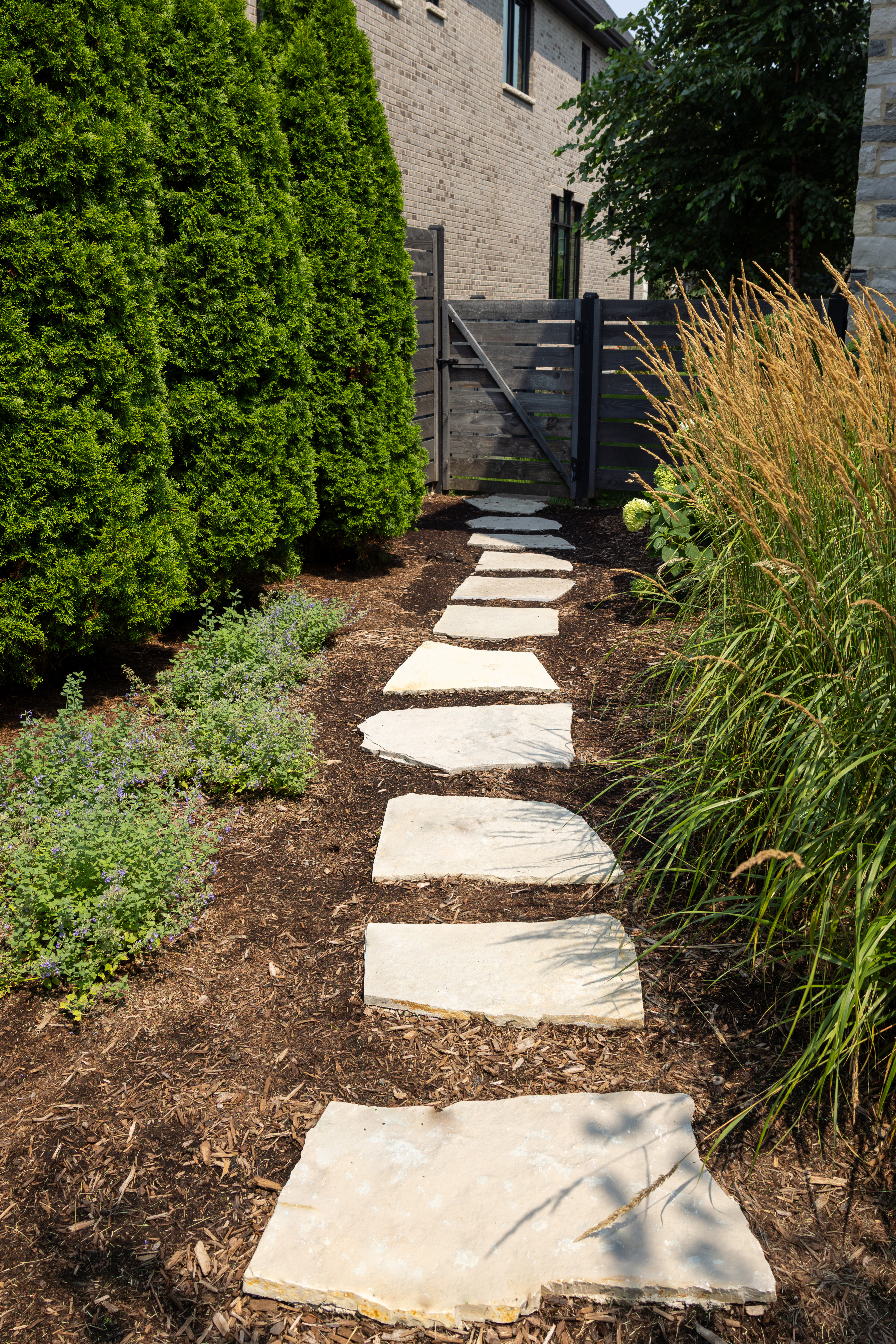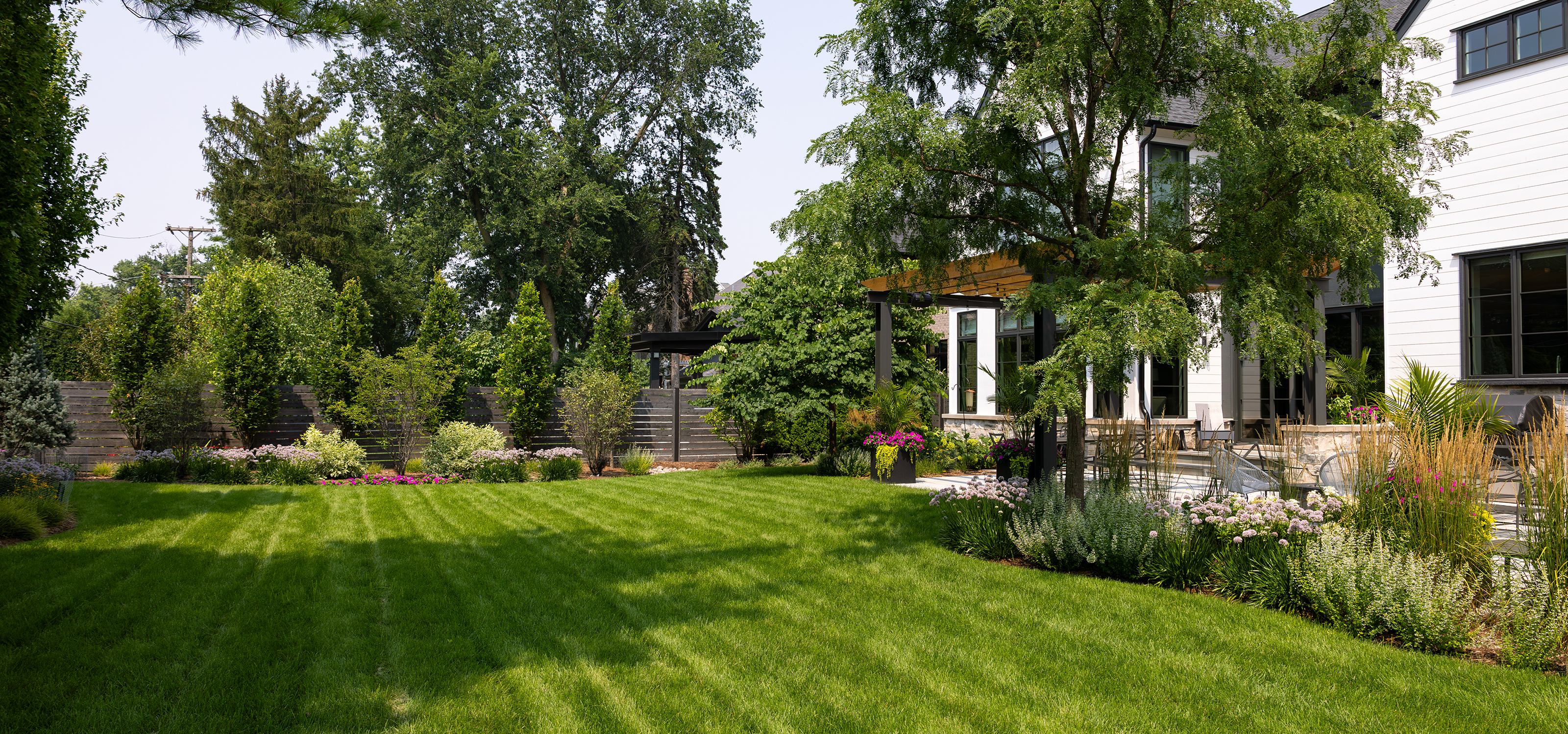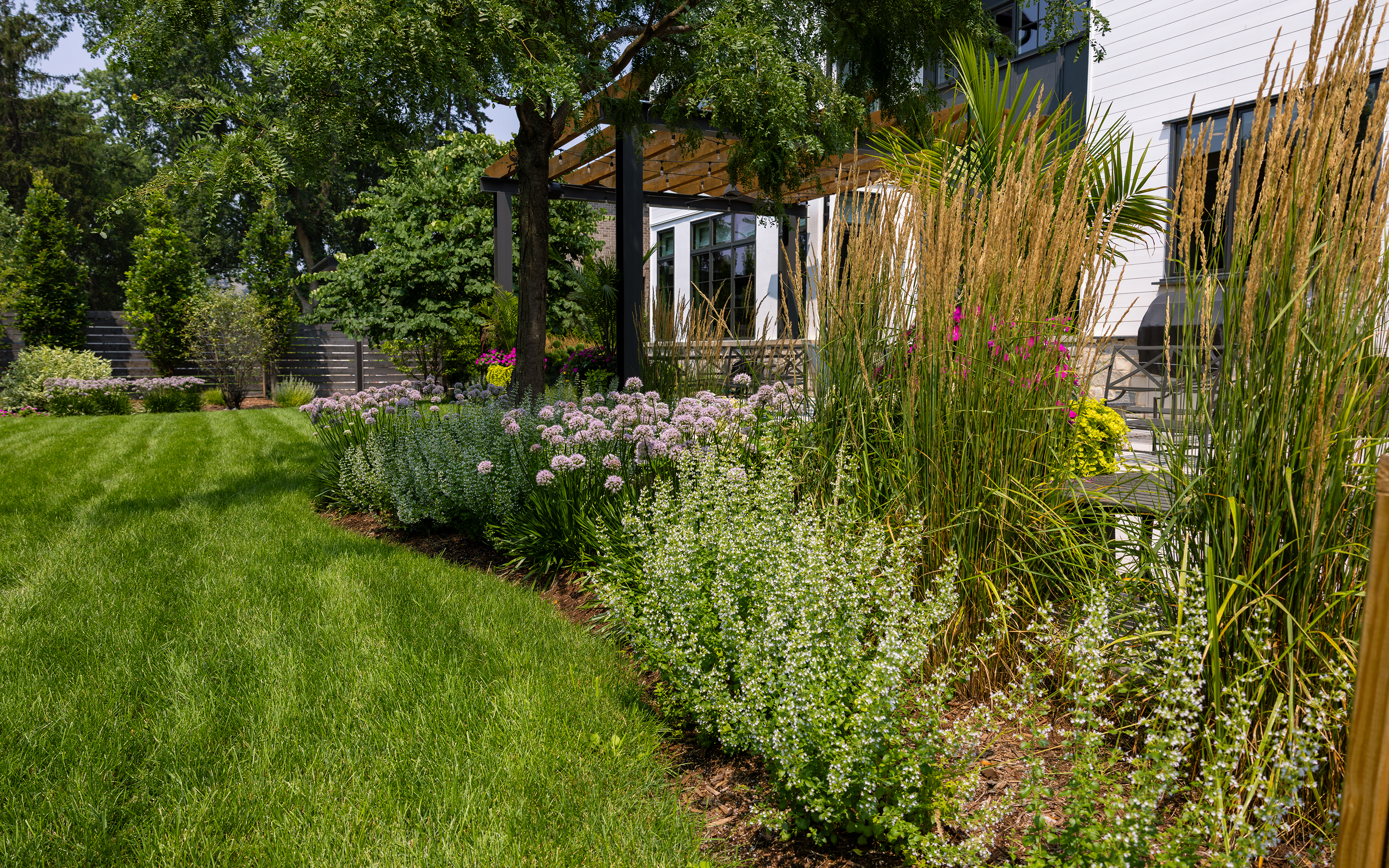 Morning coffee tastes better in a outdoor living space like this. Surrounded by lush greenery, warm tones and relaxed vibes define this outdoor living space. Featuring a wooden pergola with string lights, a cozy dining area, and a built-in grill, this backyard is perfect for easy mornings and dinner parties with friends.
