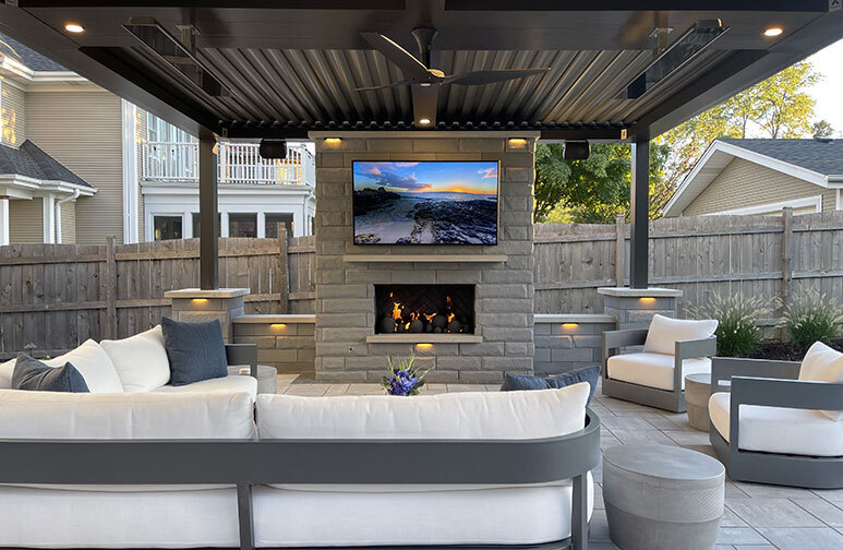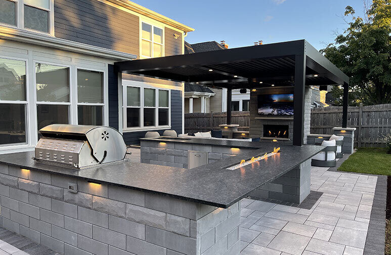 Clean lines and a monochromatic color scheme set the tone for this backyard entertaining space that is packed full of features like a floating bar with fire trough, built in ice chest, Bromic heaters and a louvered pergola.