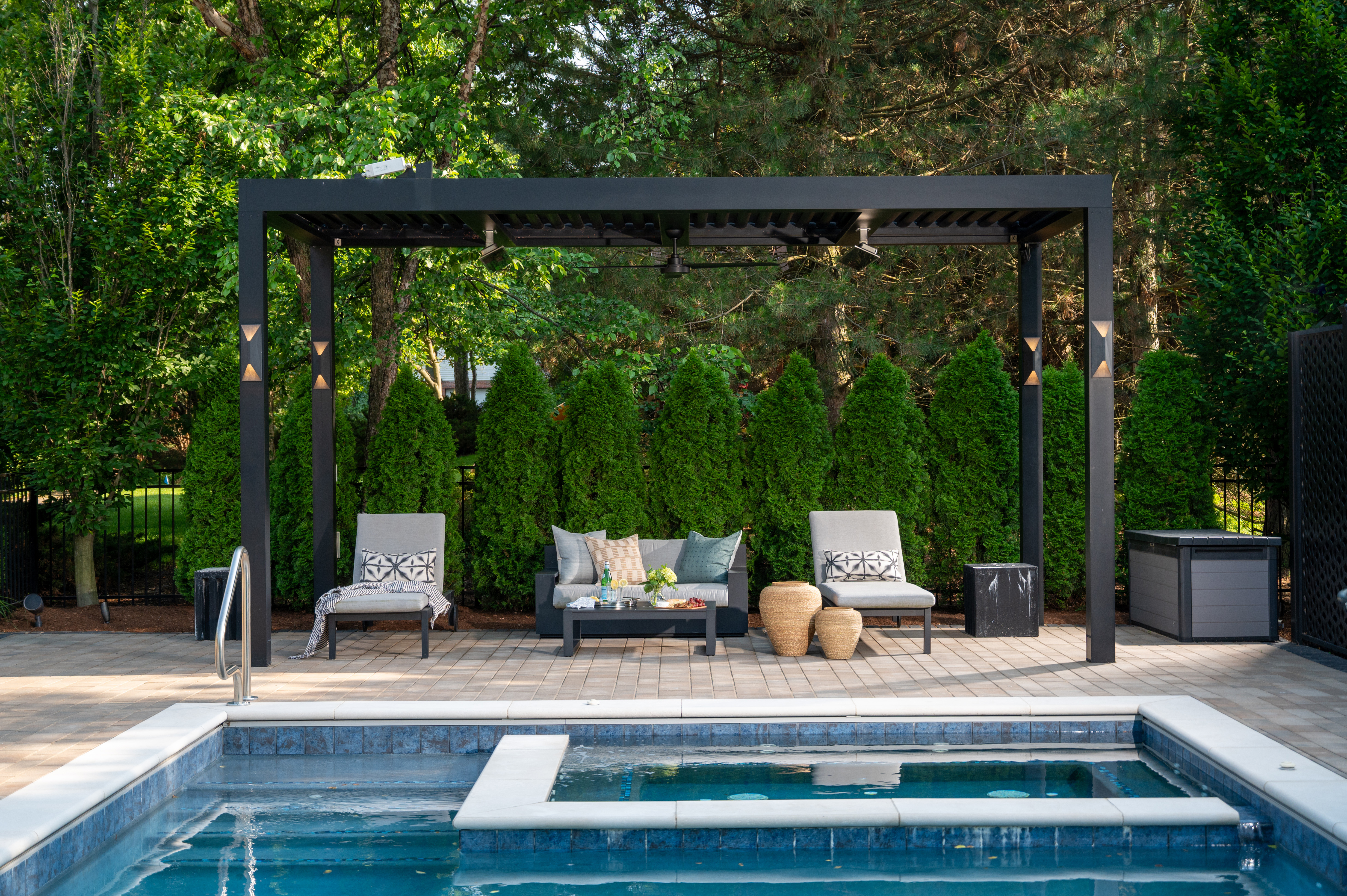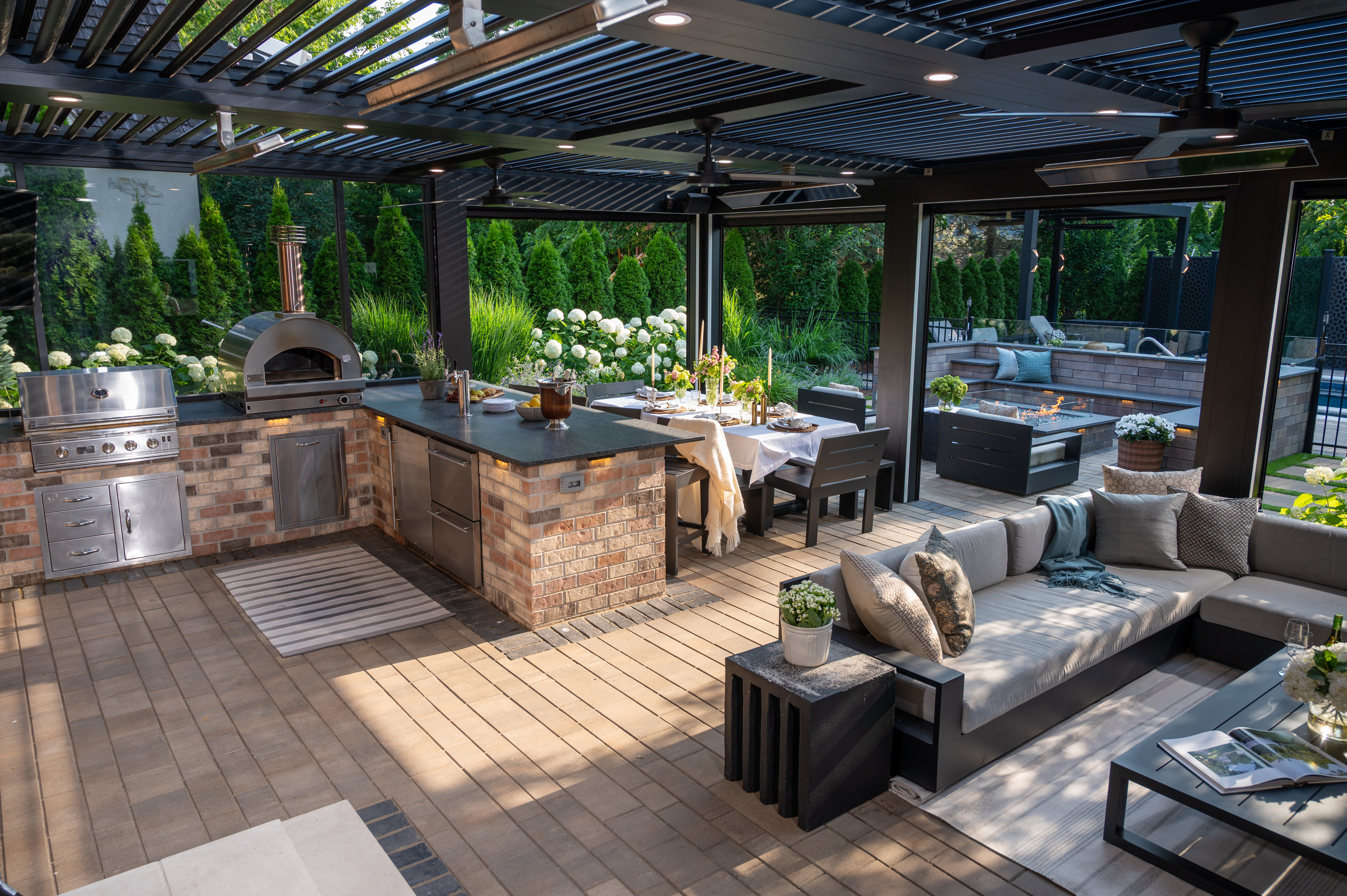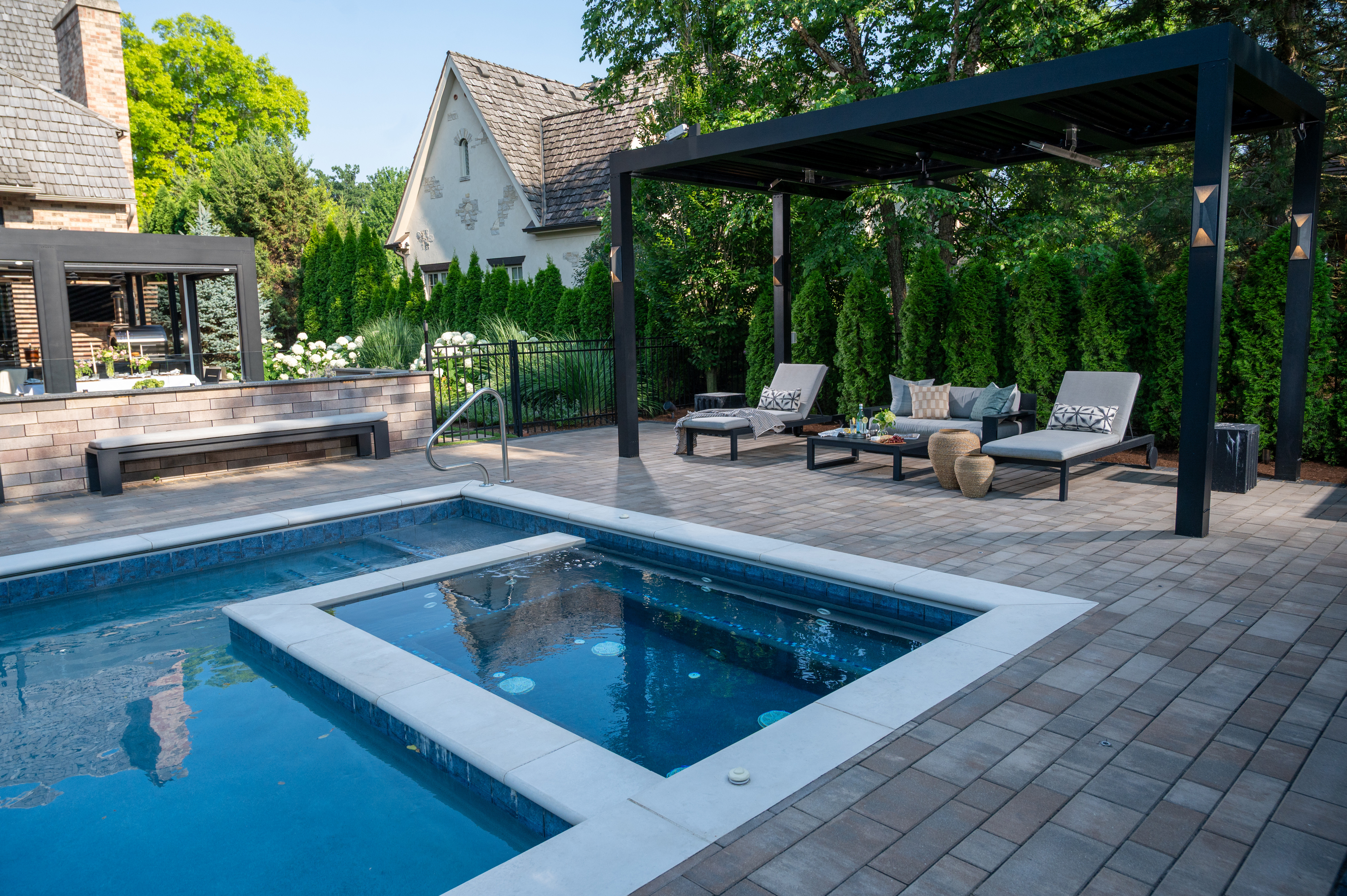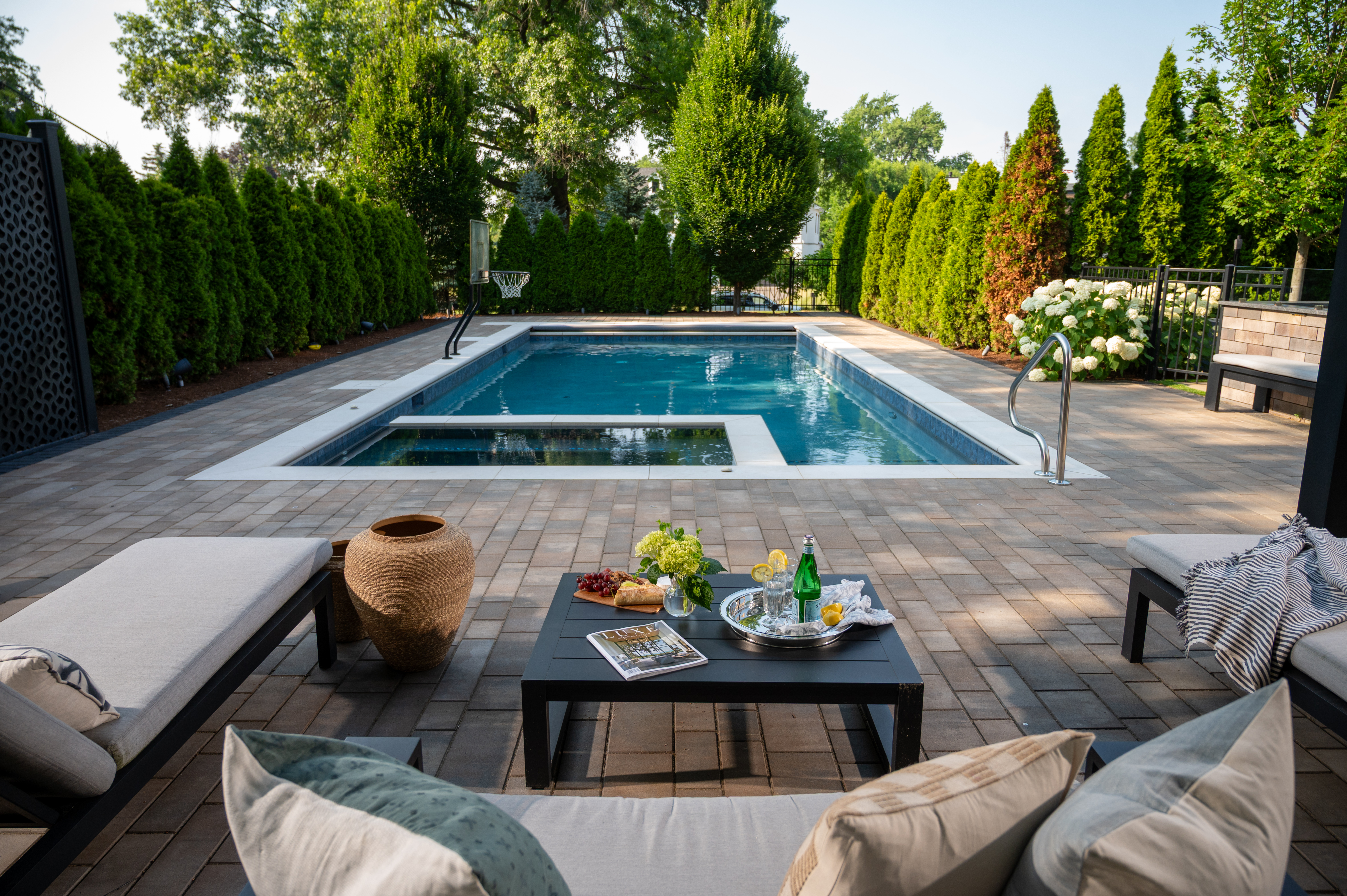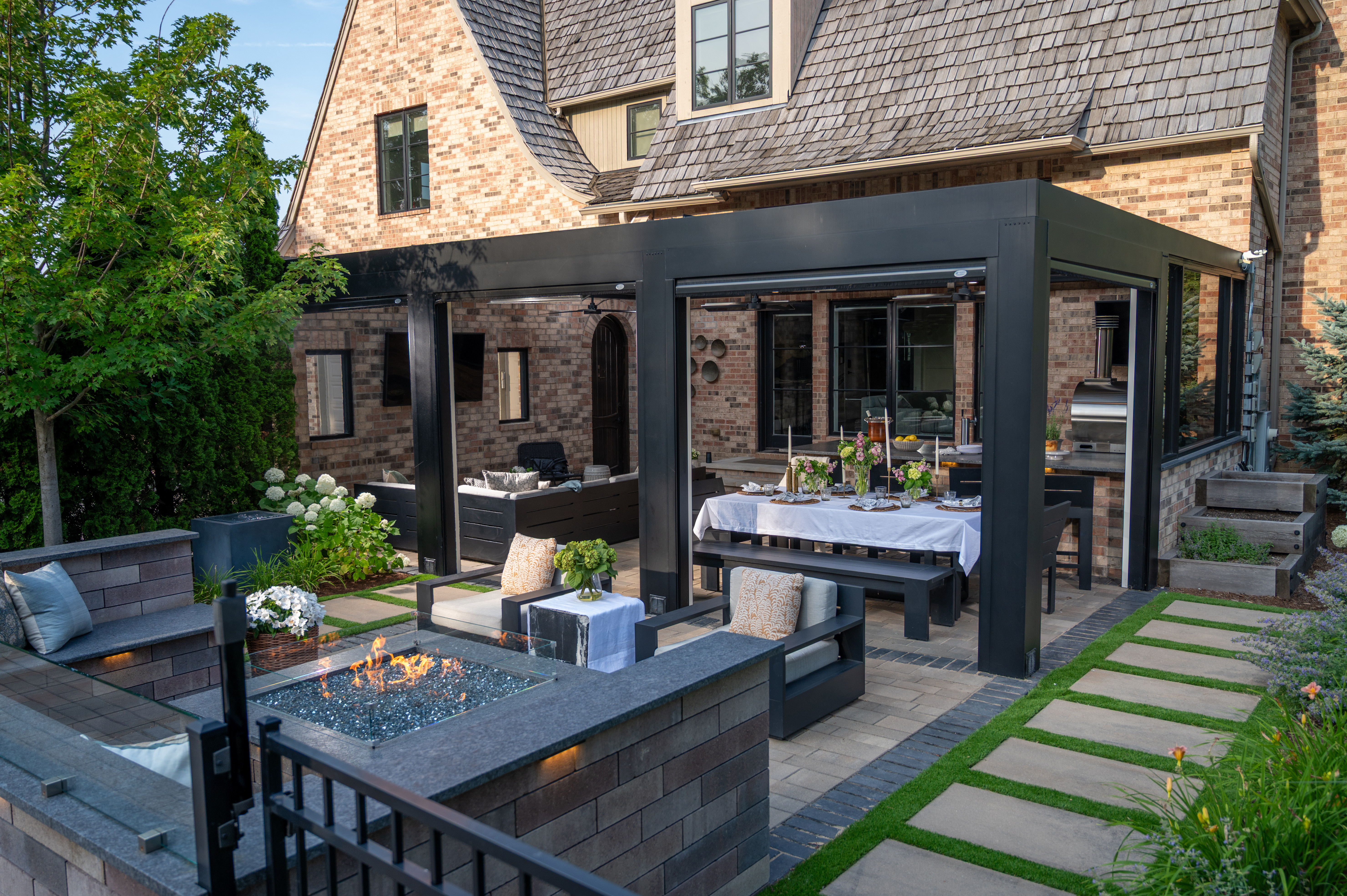 This outdoor transformation has everything you need for the ultimate staycation: in-ground pool with lounge space, fire table, outdoor kitchen, and plenty of cozy seating. This backyard is truly a space you'll never want to leave.