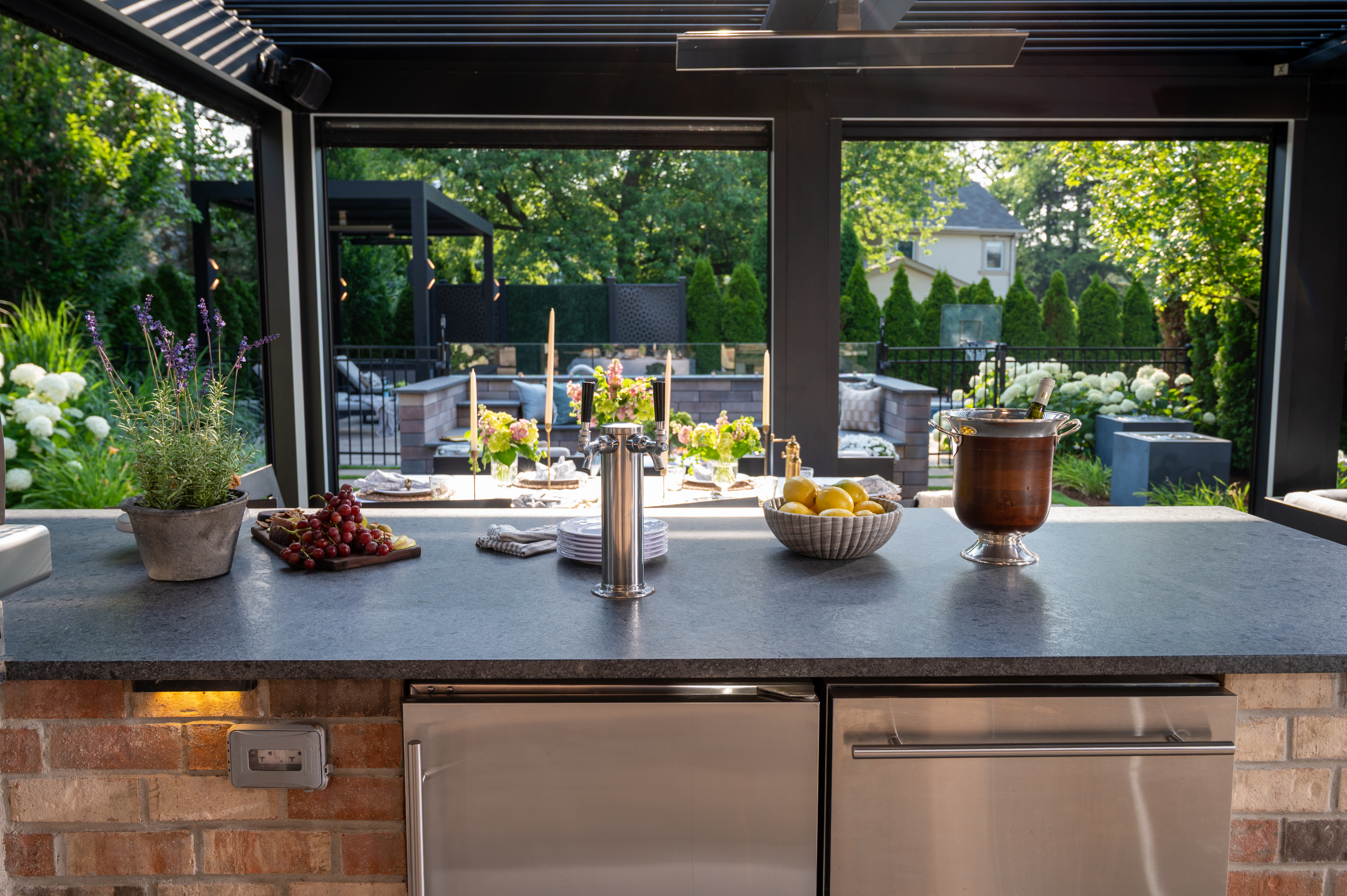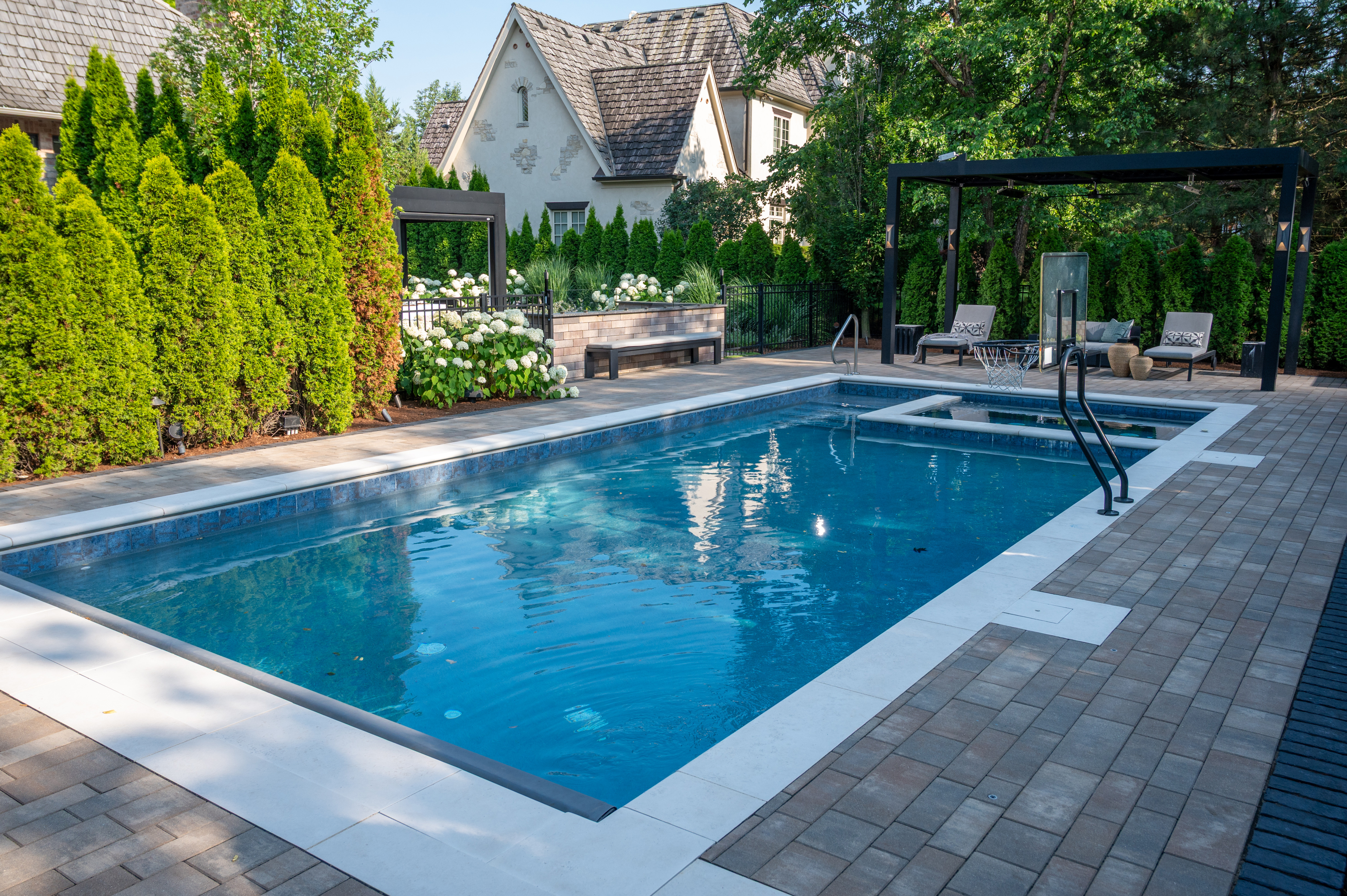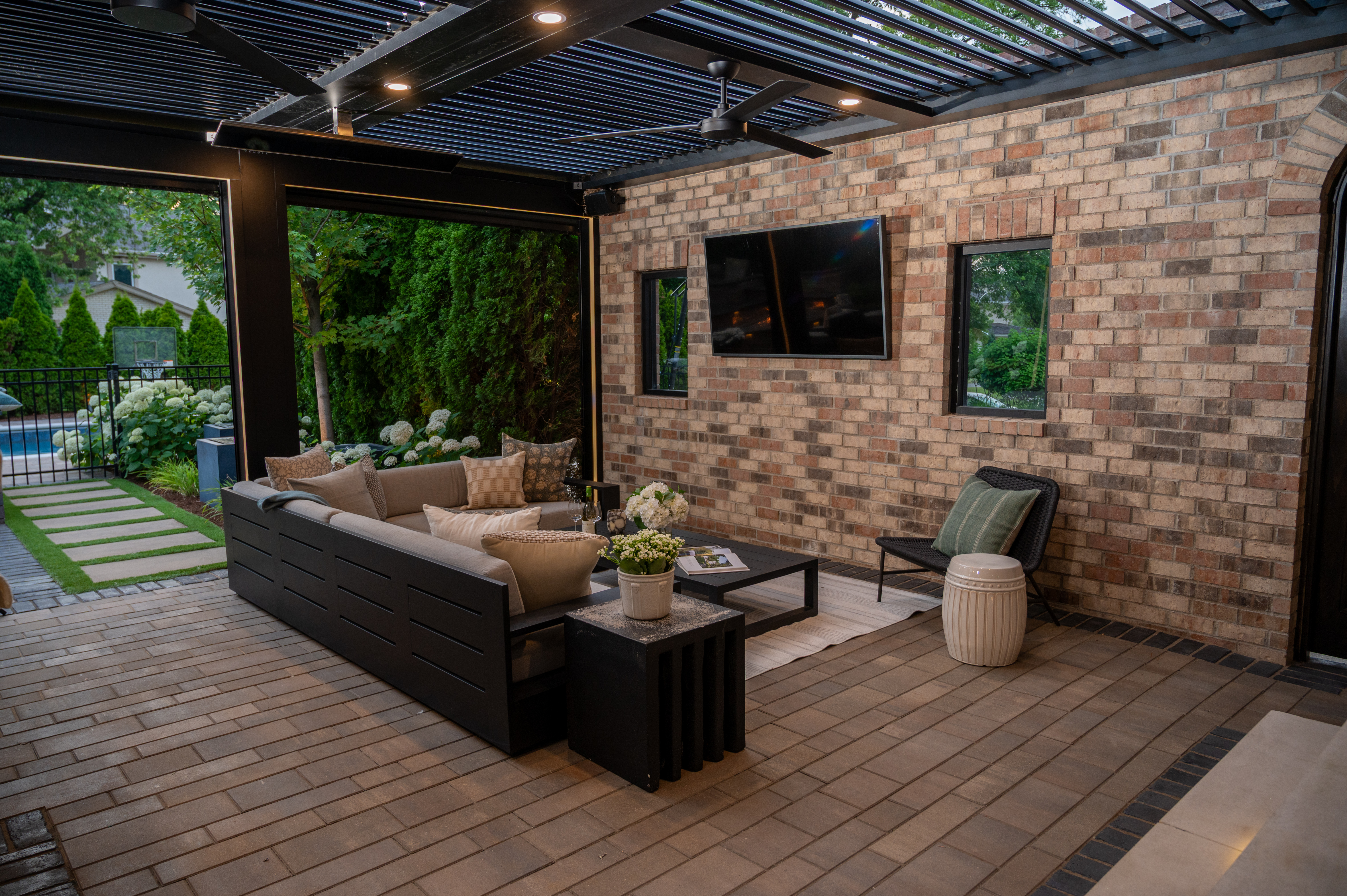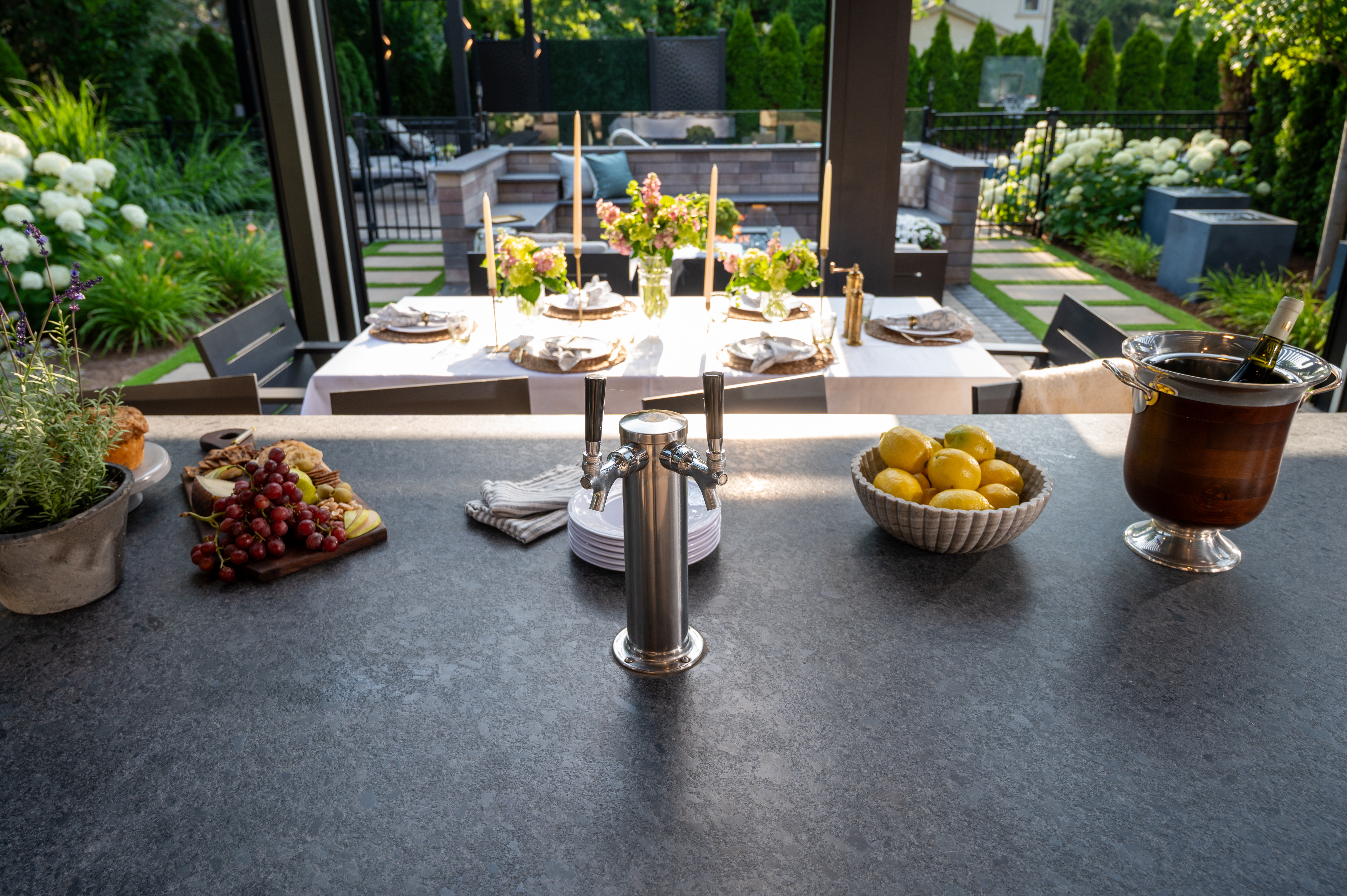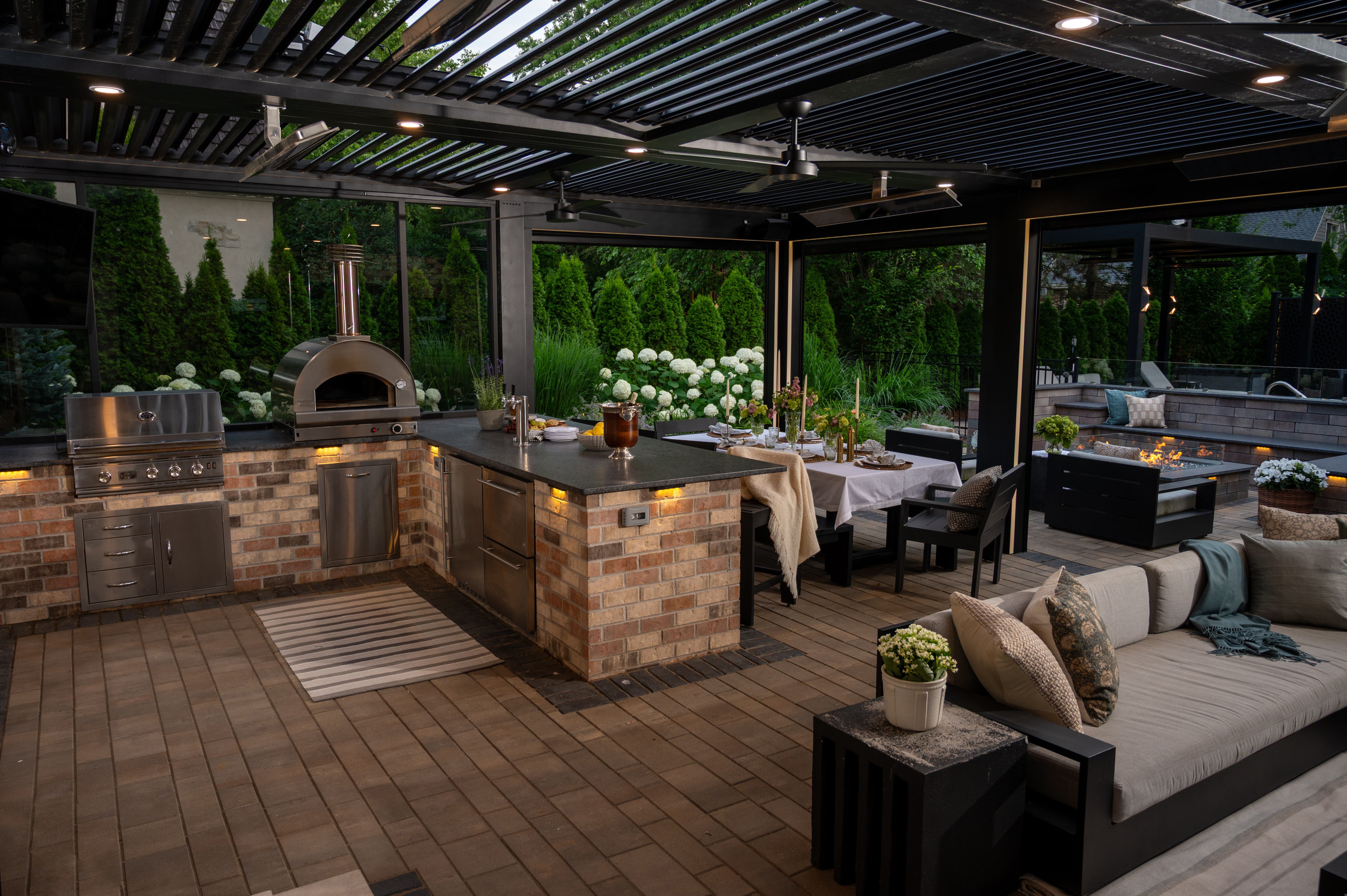 This outdoor transformation has everything you need for the ultimate staycation: in-ground pool with lounge space, fire table, outdoor kitchen, and plenty of cozy seating. This backyard is truly a space you'll never want to leave.