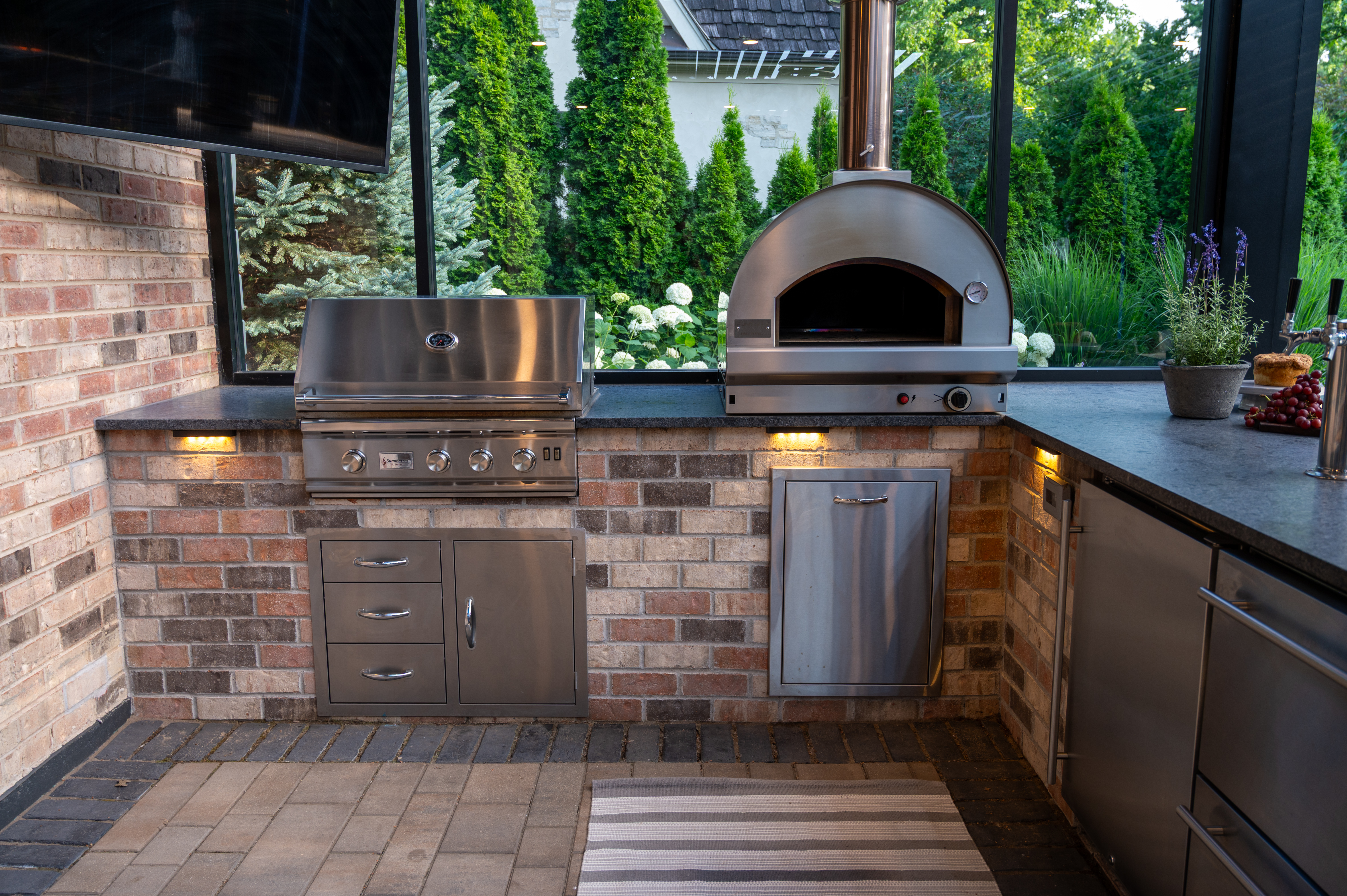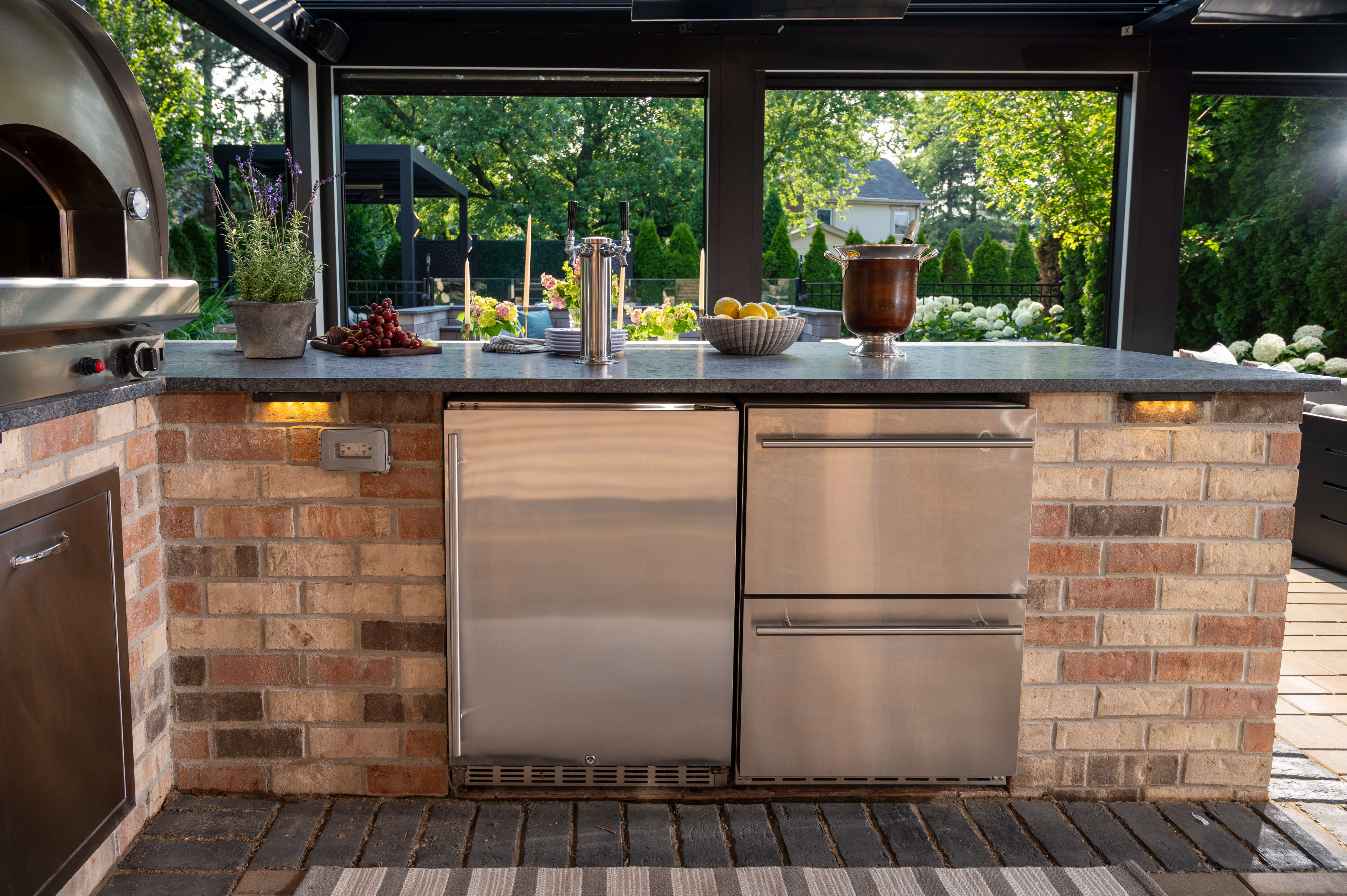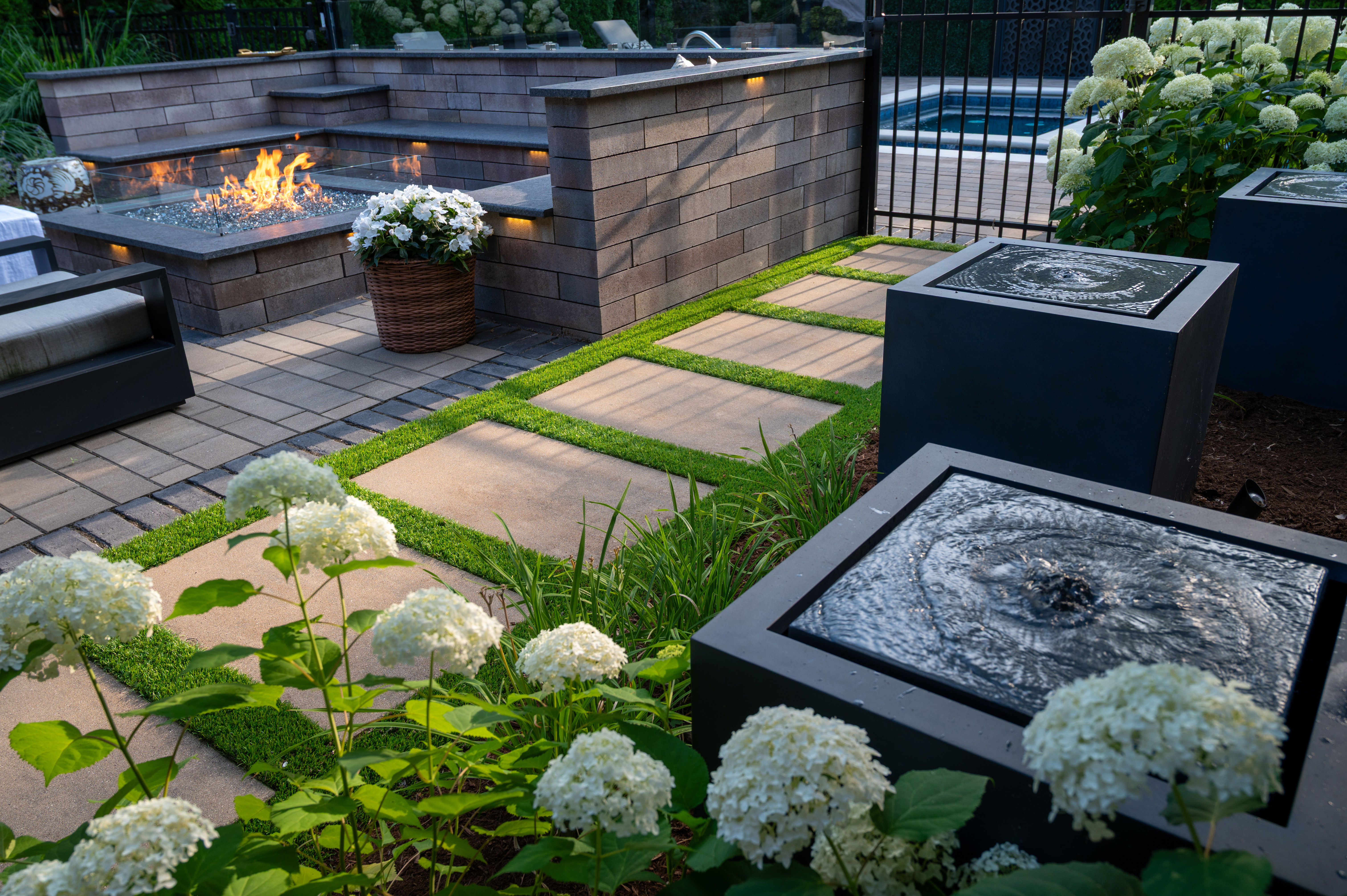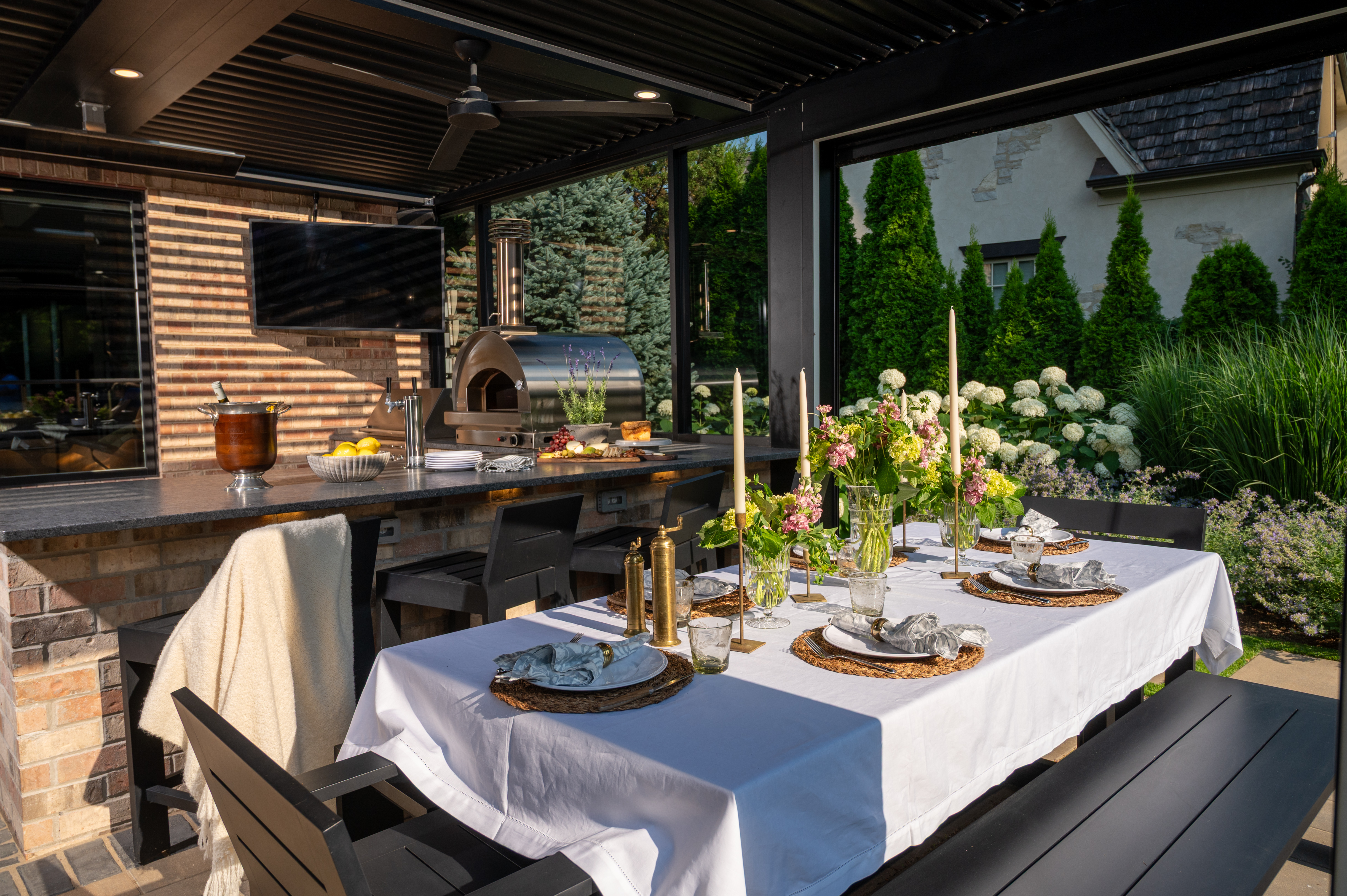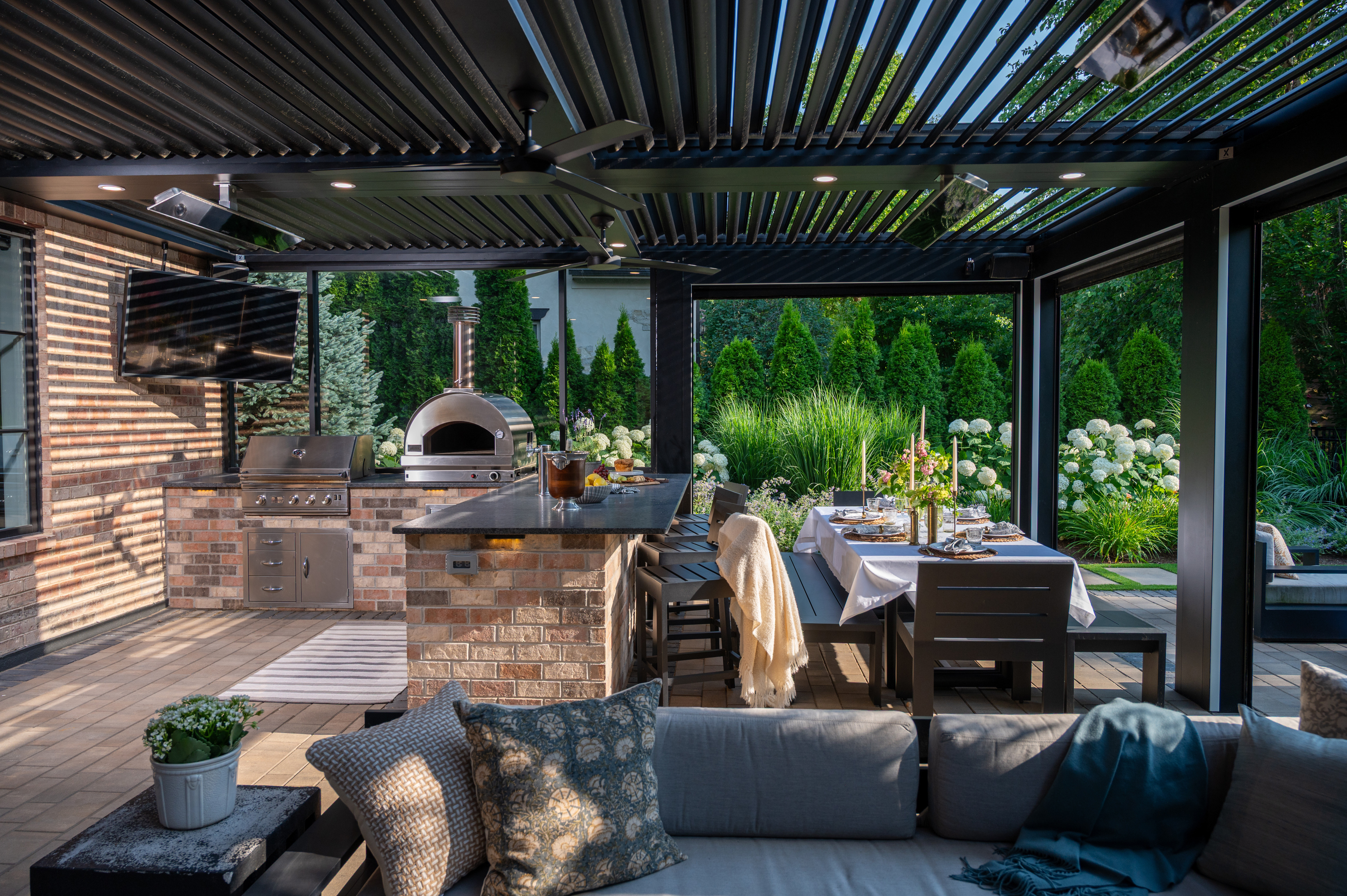 This outdoor transformation has everything you need for the ultimate staycation: in-ground pool with lounge space, fire table, outdoor kitchen, and plenty of cozy seating. This backyard is truly a space you'll never want to leave.